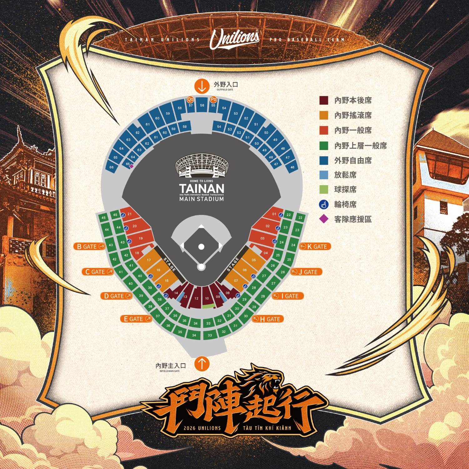 5、獅隊主場內野採全主場應援,客隊應援區規劃在左外野65區