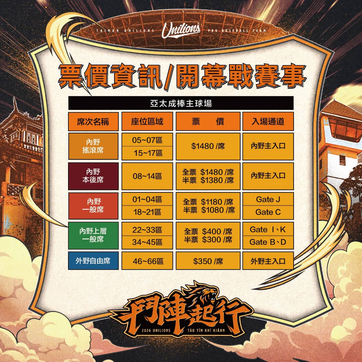 ▍統一獅亞太主場開幕戰-票價資訊 ▍