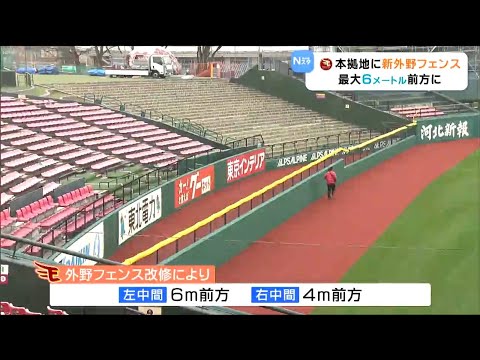 楽天の本拠地「楽天モバイル 最強パーク」の外野フェンスの移設工事が完了。左中間が6メートル、右中間が4メートル狭くなった。この日、選手は全体練習前に外野フェンス沿いを歩いて確認。投手陣からは「ヤバ ...