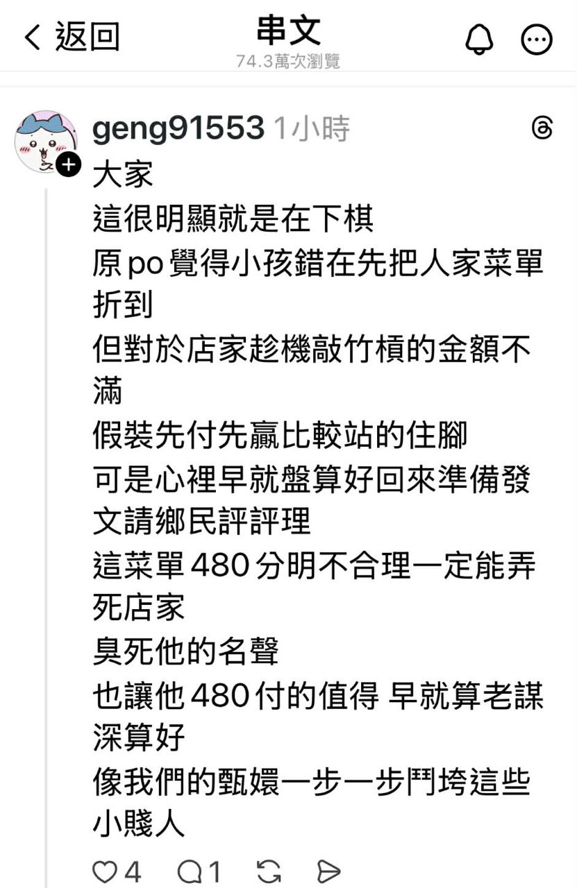 : 悶,質疑店家收費過高,同時貼文在Thraeds上引起討論。
